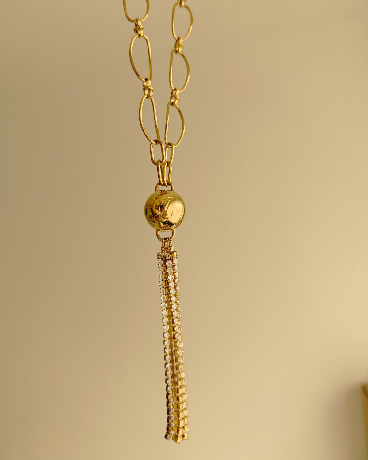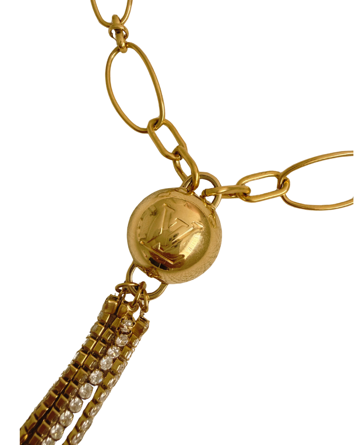The polished LV sphere anchors cascading crystal strands that catch the light with every movement. Suspended from an elongated gold link chain, this design blends modern structure with evening glamour.